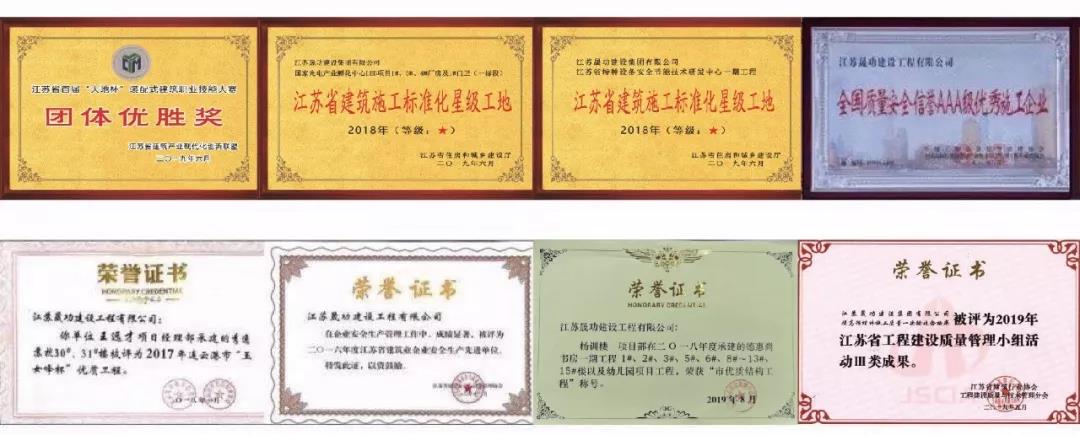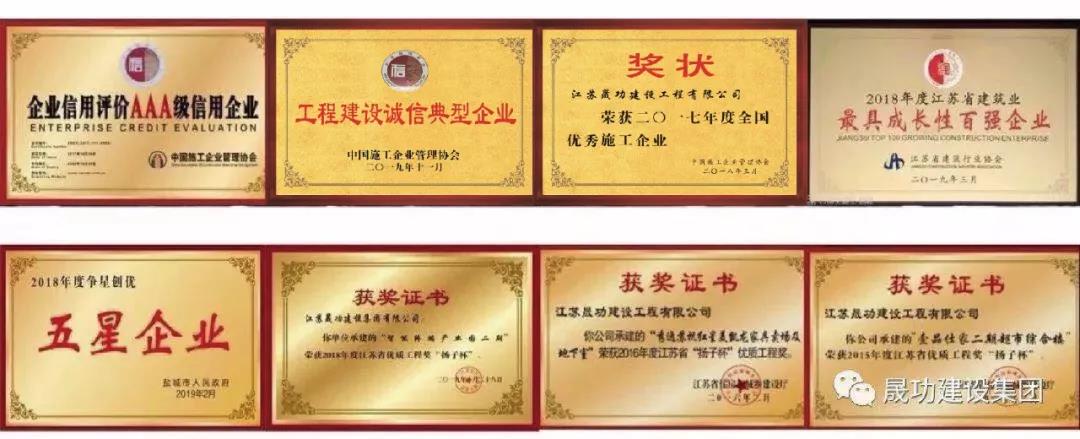 晟功建設(shè)集團(tuán)立足江蘇,面向全國,已將業(yè)務(wù)延伸至安徽、浙江、遼寧、河南、甘肅、山東、新疆、黑龍江等省市,承建了一大批精品工程,相繼榮獲“揚(yáng)子杯”、“玉女峰杯”、“鹽阜杯”等百余項(xiàng)榮譽(yù)。晟功建設(shè)集團(tuán)憑借良好的誠信口碑和高效卓越的運(yùn)營質(zhì)量,從無社會矛盾、經(jīng)濟(jì)糾紛、法律官司,連續(xù)多年在全省免交農(nóng)民工工資保證金,被評為“全國企業(yè)社會信用評價(jià)AAA級信用企業(yè)”、“全國優(yōu)秀施工企業(yè)”、“工程建設(shè)誠信典型企業(yè)”、“江蘇省最具成長性百強(qiáng)企業(yè)”、“鹽城市建筑業(yè)發(fā)展工作先進(jìn)企業(yè)”,連續(xù)3年獲得鹽城市“星級企業(yè)”2019年在南京舉辦的江蘇省“大地杯”裝配式建筑職業(yè)技能競賽中,晟功建設(shè)集團(tuán)獲得了“團(tuán)體優(yōu)勝獎”的好成績。